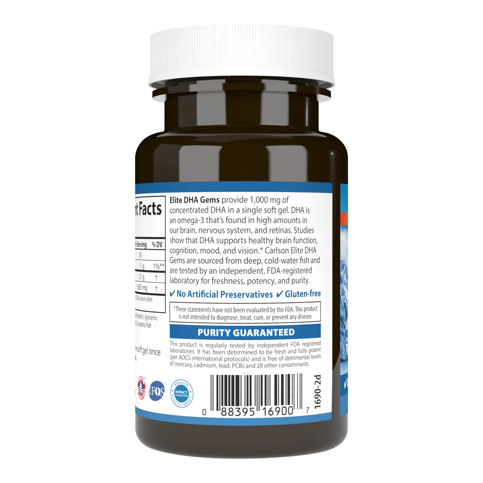 Elite DHA Gems® provide a highly concentrated dose of 1,000 mg of the beneficial omega-3 DHA in a single soft gel. DHA is important for people of all ages and women who are pregnant or nursing. DHA is found primarily in fatty fish such as salmon, mackerel, and sardines. But most of us don't receive enough through diet alone, which is why a supplement can be a great option. DHA promotes brain, vision, and skin health. It's also an important prenatal supplement and breast milk component that supports healthy brain and vision development in growing children.