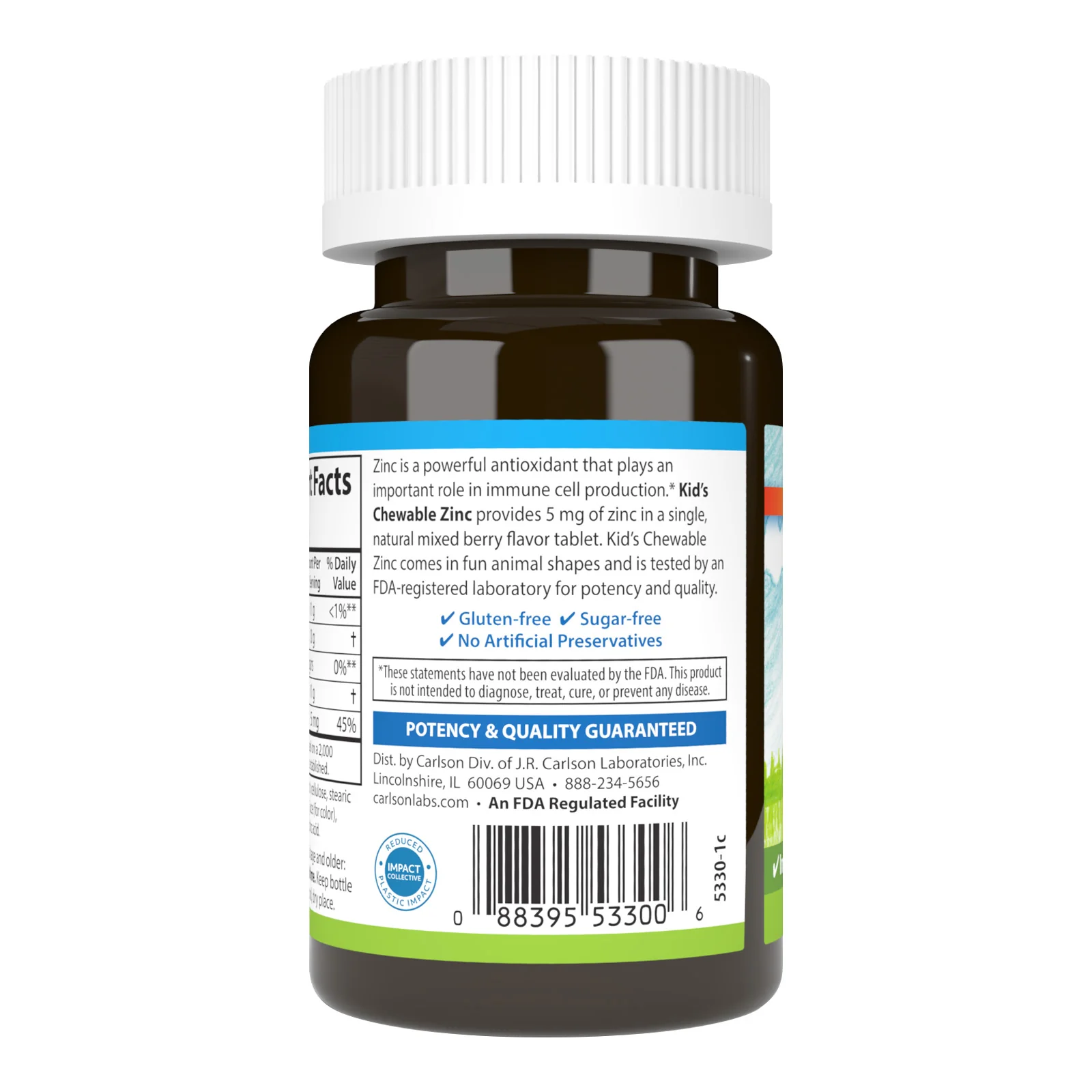Kid's Chewable Zinc provides 5 mg of zinc in a single tablet, the recommended daily intake of the National Academy of Sciences for children ages 4 to 8. Kid's Chewable Zinc comes in fun animal-shaped chewables and has a delicious, natural mixed berry flavor that kids love. And like all Carlson products, it's tested by an FDA-registered laboratory for potency and quality.