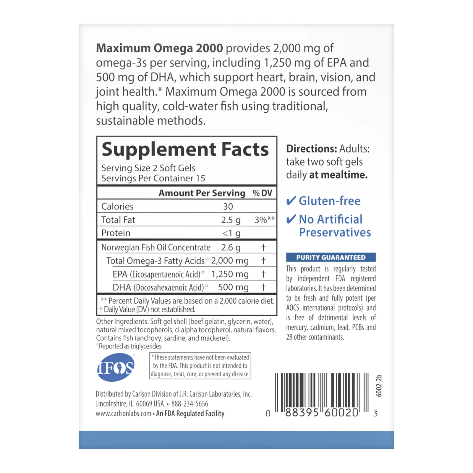 To ensure freshness, Maximum Omega 2000 is closely managed from sea to store. We source the highest quality, deep, cold-water fish using traditional, sustainable methods. Our fish are then transported to a highly regulated facility for processing and purification. Maximum Omega 2000 is tested by an FDA-registered laboratory for freshness, potency, and purity. Support your body on-the-go with the omega-3s it needs for optimal health with Carlson Maximum Omega 2000 Grab + Go Packs.
