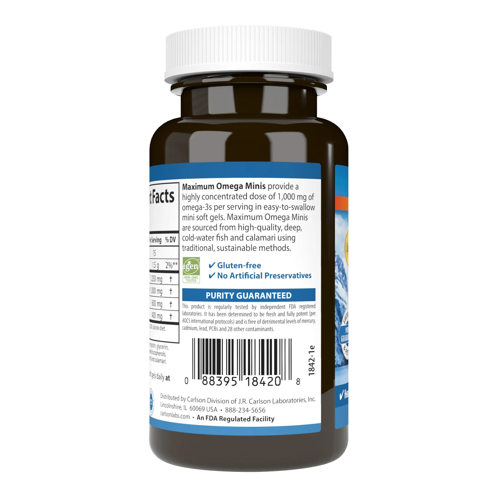 Carlson Maximum Omega Minis provide 1,000 mg of omega-3s per serving, including 600 mg of EPA and 400 mg of DHA in easy-to-swallow mini soft gels. Maximum Omega Minis are IFOS and IGEN non-GMO certified, and are tested by an FDA-registered laboratory for freshness, potency, and purity. To ensure maximum freshness, Maximum Omega Minis are closely managed from sea to store. We source the highest quality, deep, cold-water fish using traditional, sustainable methods. Our fish are then transported to a highly regulated facility for processing and purification. Maximum Omega Minis are encapsulated in mini soft gels and are tested by an FDA-registered laboratory for freshness, potency, and purity. Support your body with the omega-3s it needs for optimal health with Carlson Maximum Omega Minis.