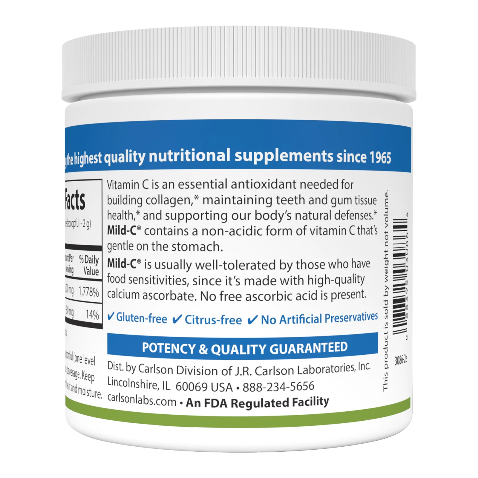 Vitamin C is an essential antioxidant that supports healthy immune system function, teeth, and gum tissue health, and the body's natural defense system. Carlson Mild C® Powder is made from pure calcium ascorbate, a combination of calcium and vitamin C, making it mild on the teeth and gentle in the stomach. Each 1/2 teaspoon contains 1,600 mg of vitamin C. Mild-C® Powder can be placed in water or a flavored drink.