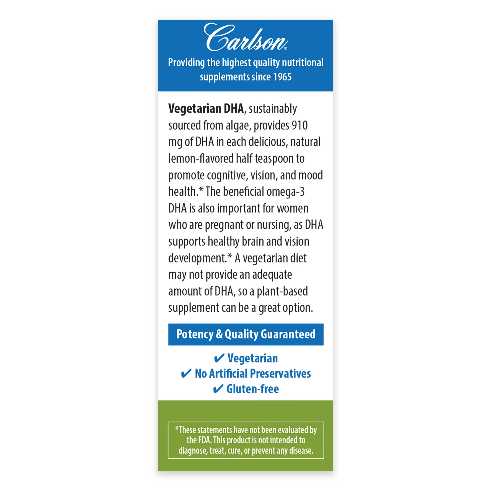 Vegetarian DHA comes in delicious, natural lemon flavor and can be taken directly from the spoon or mixed into yogurt, blended into a smoothie, or poured over a salad. Carlson Vegetarian DHA provides 910 mg of DHA in a single half teaspoon and is tested by an FDA-registered laboratory for freshness, potency, and purity.